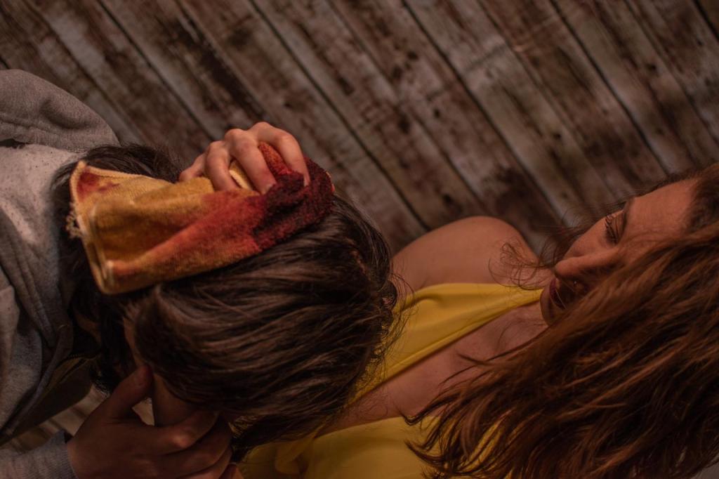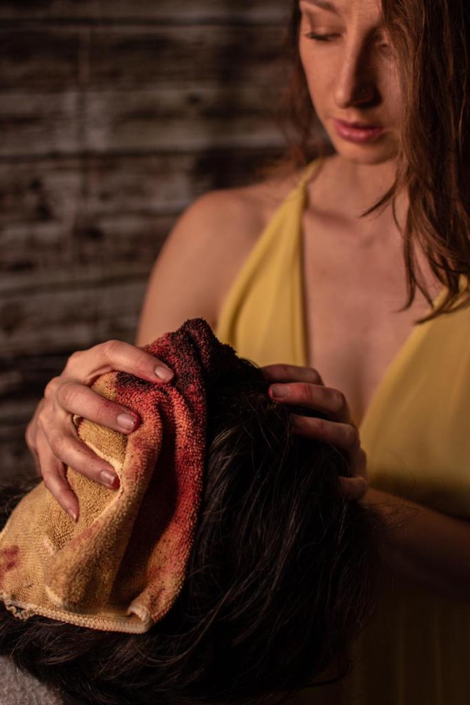 Sin contestar, corrí por el trapo de la cocina y con presión lo envolví sobre su cabeza. El trapo amarillo se tornó rojo oscuro y brillante rápidamente.